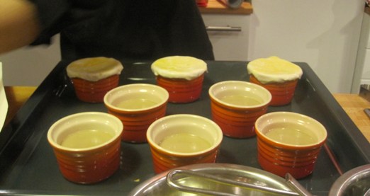 Disponer sobre los ramequins. Con el hojaldre sobrante se puede hacer algún motivo decorativo si se desea como lazos, trenzas, etc.