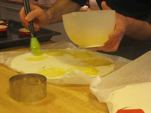Por otro lado, estirar el hojaldre, pintar con la yema de huevo y troquelar con aros metálicos que sean de diámetro mayor al de la cocotte o ramequin.
