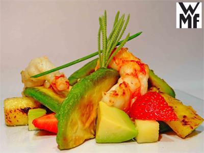 PASO A PASO:- Cortar el aguacate y quitar la semilla central usando el cuchillo de verdura de WMF. Quitar la piel exterior y cortar laminas no muy gruesas. Asar la mitad en la sartén CeraDur Profi de WMF hasta que queden doradas. Cortar la otra mitad en dados crudos y reservarlos.