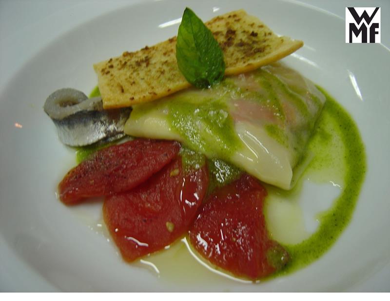 Raviolis de escalivada con pétalos de tomate, pesto genovés y crujiente de pan
